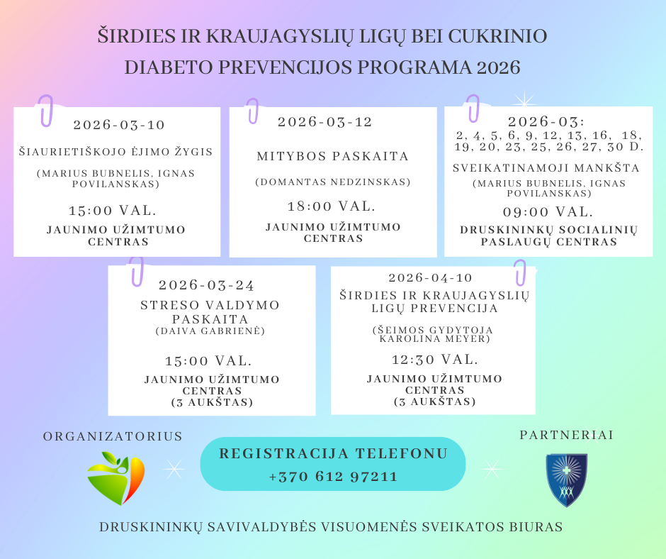 2026 01 27Kviečiame registruotis į širdies ir kraujagyslių ligų bei cukrinio diabeto prevencinę programą 2026 ! Širdies ir kraujagyslių ligų bei cukrinio diabeto prevencijos programa yra sveikatos stiprinimo iniciatyva, kurios tikslas – supažindinti gyventojus su rizikos veiksniais, sveikos gyvensenos principais ir prevencinėmis priemonėmis, taip mažinant šių ligų tikimybę ir gerinant gyvenimo kokybę. Programa yra skirta: suaugusiems asmenims, kuriems yra nustatyta rizika susirgti širdies ir kraujagyslių ligomis ar cukriniu diabetu, taip pat visiems norintiems gerinti savo žinias ir sveikatą, net jei dar nėra aiškių simptomų, dalyvauti gali asmenys nuo 18 metų ar pagal konkrečias vietos programos taisykles. Registracija telefonu: +370 612 97211 Rūpinkitės savo sveikata šiandien – prevencija yra svarbiausias žingsnis į ilgesnį ir kokybiškesnį gyvenimą.
